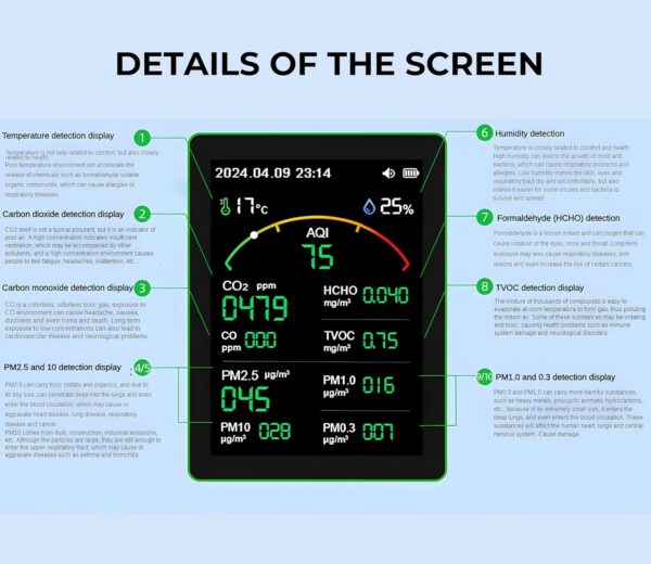 | Parameter Detection | 1. AQI (Air Quality Index) 2. COâ‚‚ (Carbon Dioxide) 3. PM0.3 / PM1.0 / PM2.5 / PM10 4. CO (Carbon Monoxide) 5. TVOC (Total Volatile Organic Compounds) 5. HCHO (Formaldehyde) 6. Temperature & Humidity 7. And more, with real-time display and wireless reporting. |